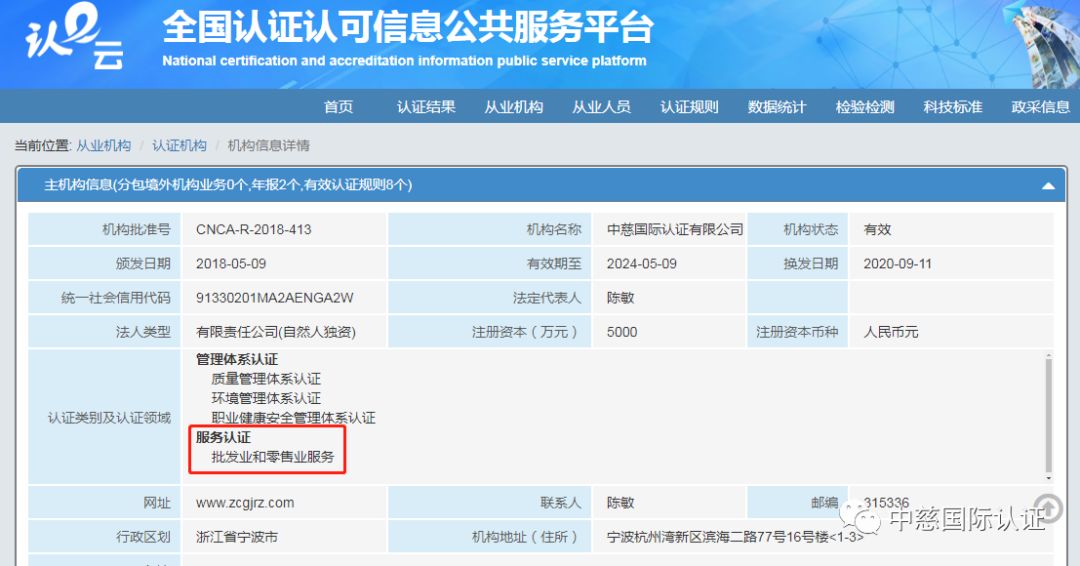 中慈國際認證自2018年運營以來,從最初的只有ISO9001認證,發展到如今,已擁有12種領域認證資格,即ISO9001質量管理體系、ISO14001環境管理體系、ISO45001職業健康安全管理體系、SA8000社會責任管理體系、ISO28000供應鏈安全管理體系、GB/T 31950企業誠信管理體系、HSE健康安全環境管理體系、ISO13485醫療器械質量管理體系、GB/T27925-2011企業品牌評價體系、GJB9001C-2017軍工產品質量管理體系、ISO10015培訓管理體系、批發業和零售業服務認證。