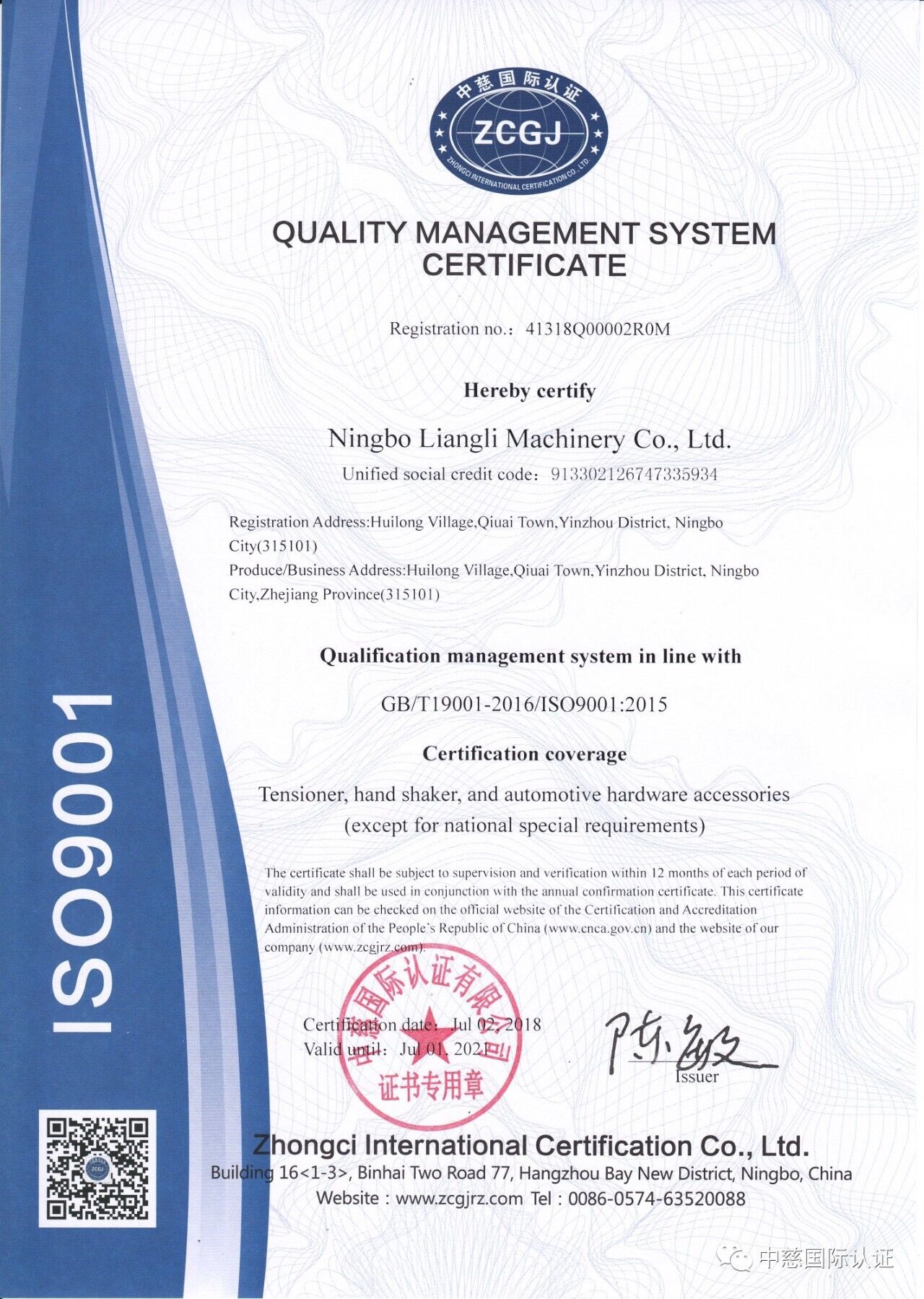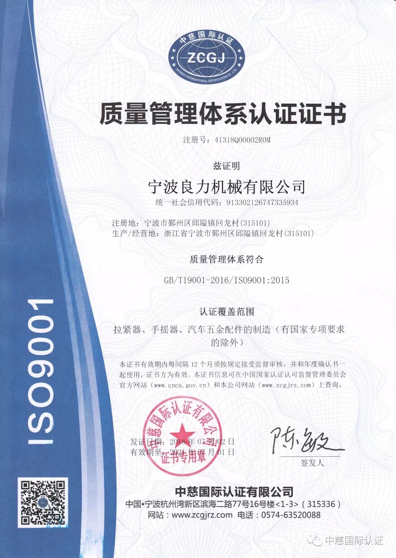 2018年6月20日上午,6月23日至6月25日下午,由中慈國際認證有限公司派出的2名審核員組成的審核組對寧波良力機械有限公司進行了為期2天半的質量管理體系的初次審核。審核組對該公司管理體系的適宜性、有效性及充分性進行了全面的審核評估,確認該公司體系運行良好,各項指標均達到初次審核標準,寧波良力機械有限公司初次審核順利通過。并于7月2日正式取得質量管理體系認證證書。