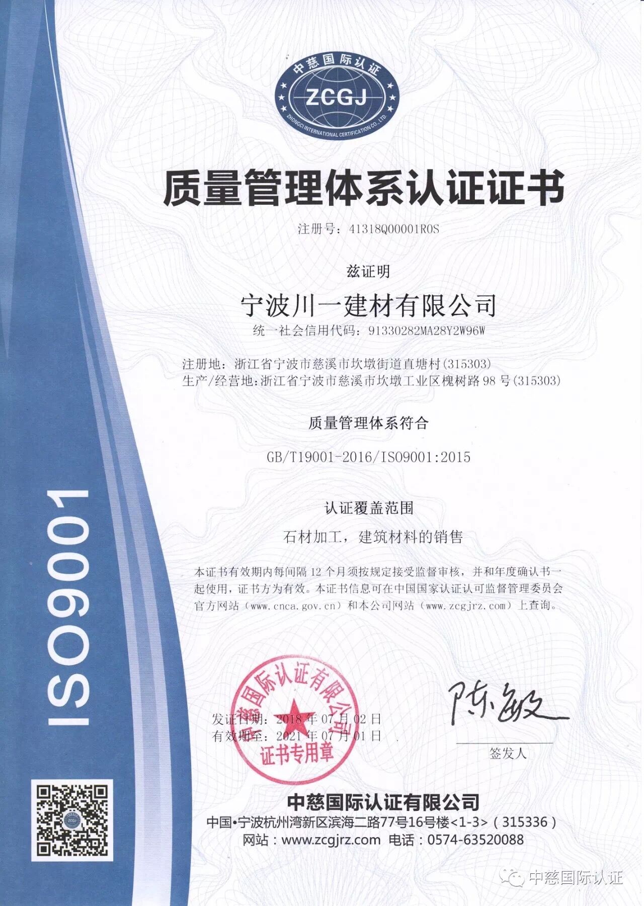此次證書發布,證明了寧波川一建材有限公司符合高質量標準要求,并為持續提高質量和盈利能力打下堅實的基礎,提高了企業的形象,增強了其在同行業的競爭實力。